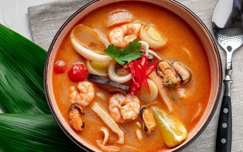 Ostra i aromatyczna zupa Tom Yum z krewetkami królewskimi, grzybami, pomidorami i egzotycznymi ziołami. To danie przeniesie Cię do Tajlandii